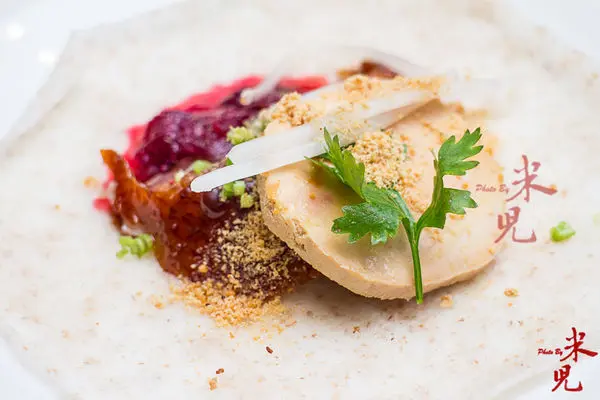 鴨子上桌,感覺它特別地肥大,原來師傅是選用足四公斤的鴨以廣式片皮鴨的燒烤方式處理而成。在桌邊先完成片皮之後,一部分夾上酸薑、蔥段和甜麵醬,另一部分則夾入鴨肝、蔓越莓醬、花生粉、銀芽和香菜,所以就有了中、西兩種不同的吃法。聽起來很怪,但咬在嘴裡卻意外協調,加入酸甜味元素,中和了鴨皮的油膩,讓在座每個人都拍案叫絕。