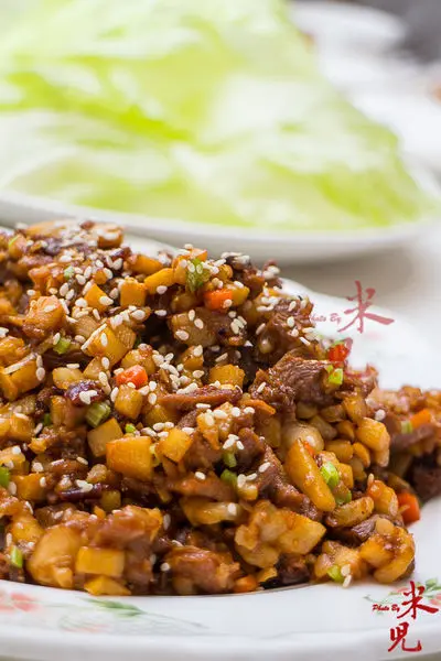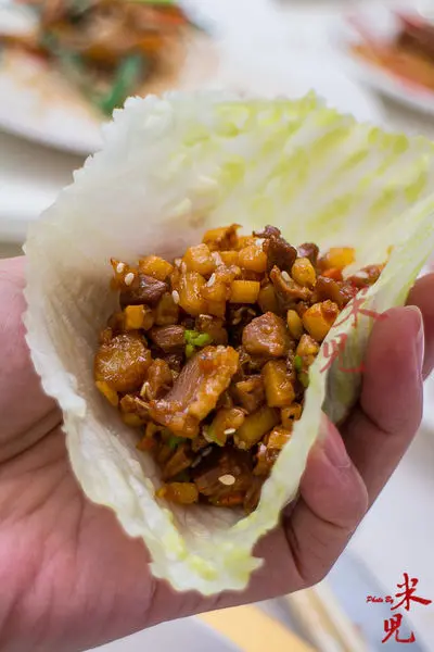 炒鴨鬆裡加了洋地瓜、芹菜、紅蘿蔔、筍丁增加口感,放在生菜上大口咬,滿嘴香。