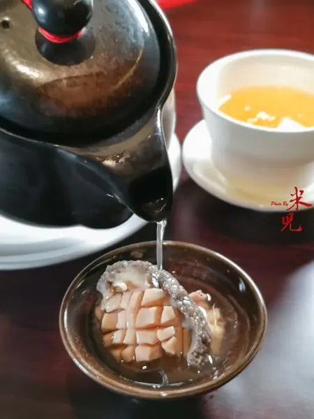 鮑魚功夫湯,1280大洋。用日式土瓶蒸概念出場的湯,茶壺裡有好吃的鮮鮑魚和雞肉。醇厚的老母雞、火腿、瘦肉香氣,過濾三次才呈現的清澈湯頭,加上鮮鮑魚蒸製出香氣悠遠的頂級美味湯品。