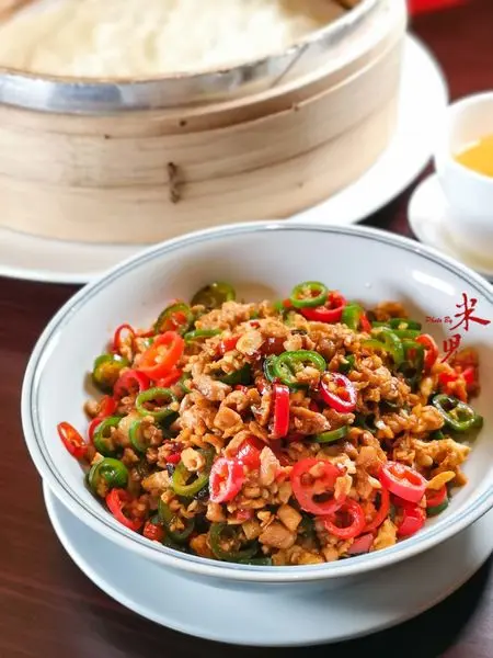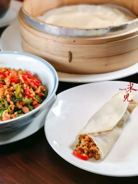 宮廷碗碗香,580大洋。用豆豉炒香的豬肉,加上青、紅辣椒的清爽香辣,吃的時候包在薄餅裡。