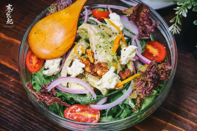 灑下了些許的焦糖核桃,和馬茲瑞拉起司,經典油醋醬汁調味,搭配雞肉食蔬吃起來健康又美味!
