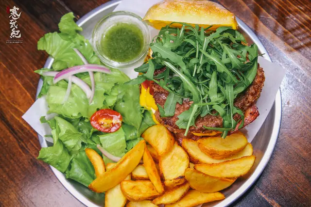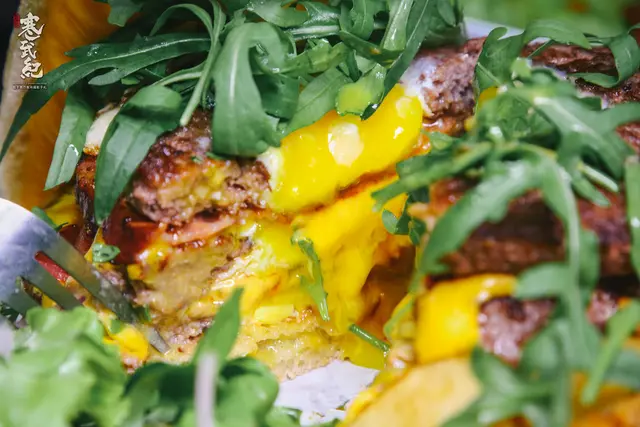 三層牛肉加上溏心蛋濃郁的蛋黃,搭配大量的芝麻葉,牛肉漢堡肉十足多汁,太好吃了!