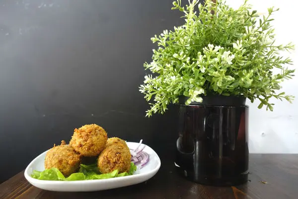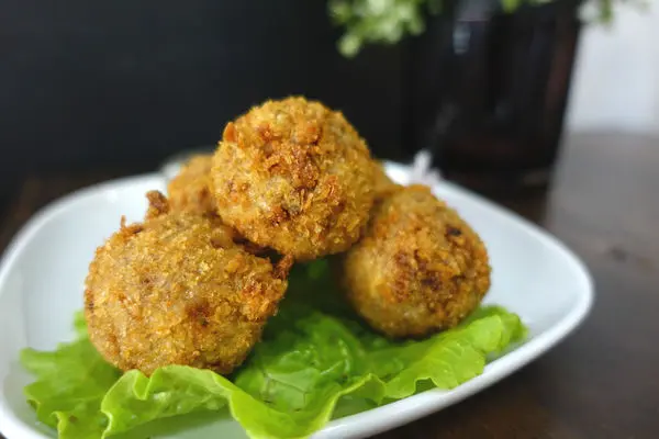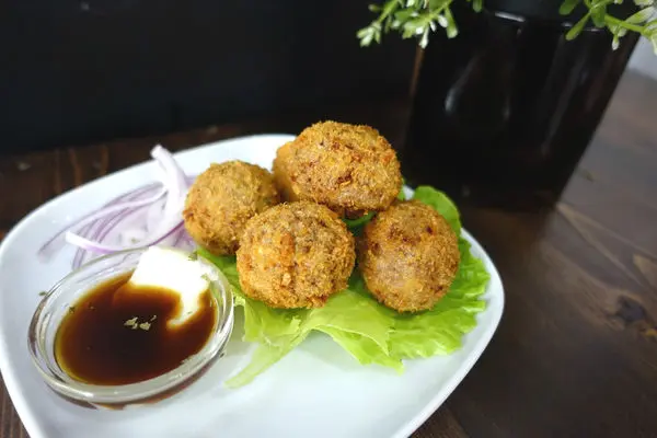 共五顆渾圓小巧的金黃炸牛肉球,外表酥酥香香但不油膩~