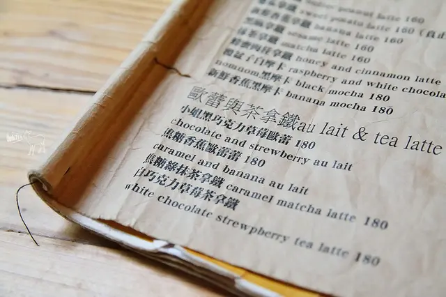 Nom Nom的菜單很復古懷舊,有些使用過的歲月痕跡感。在飲料頁看到了「焦糖香蕉歐蕾蕾」,讓我一直偷笑,問了我的女兒蕾蕾說"你要不要喝看看跟你名字一樣的飲料?",但有個性的她直說要喝奶昔。