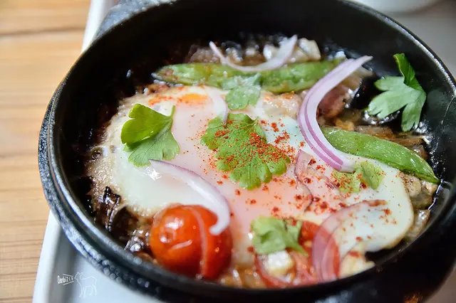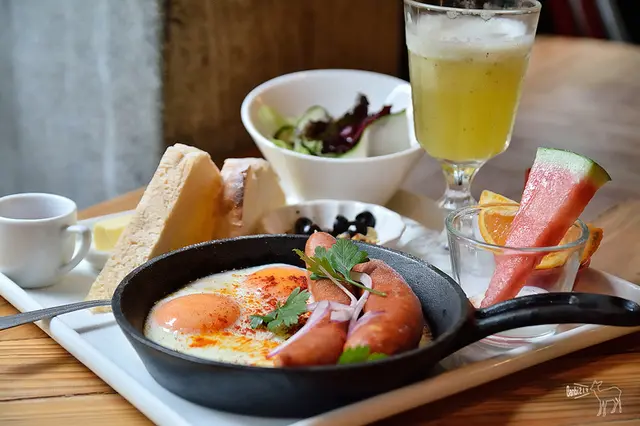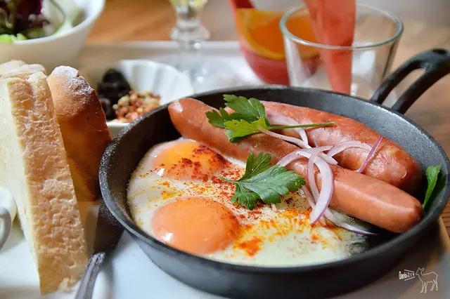香腸挑選的品項挺不錯,Q脆也不油膩,有起士的香腸滿好吃的,大約全熟至半熟煎的煎蛋跟我的餐點一樣,同樣有酸甜的油醋味搶味,我們也不大習慣。