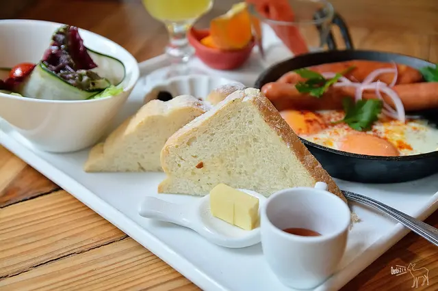 愛不釋手德式起司腸與法蘭克福腸,香煎荷包蛋,自家湯種吐司 早午餐 $340元 有附黑橄欖與芥茉醬