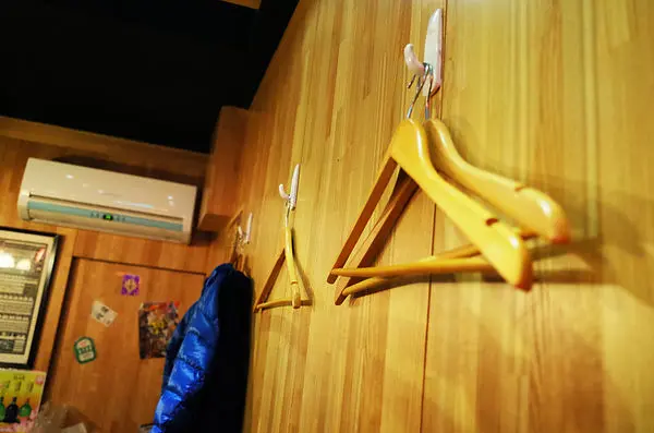 室內的後方牆上有附掛勾及衣架,方便顧客調起大衣。