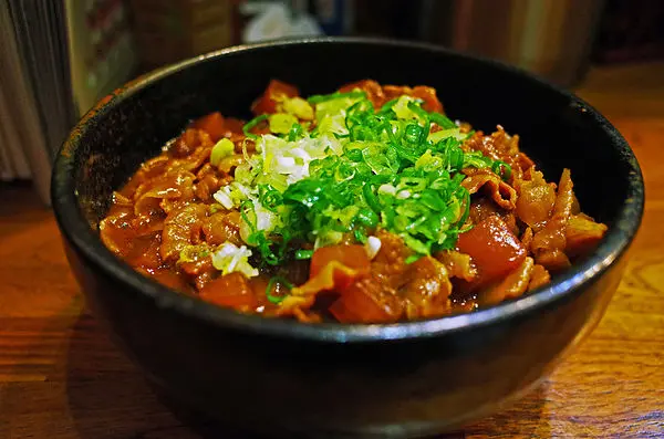 味噌醬料煮至入味的豬肉片、白蘿蔔丁、紅蘿蔔、蒟蒻、洋蔥,全融入整碗的精華湯中。