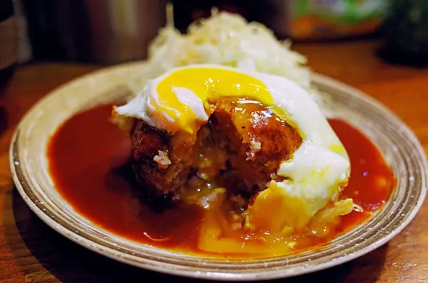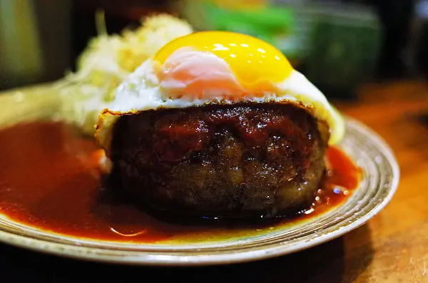 一用筷子夾開,蛋黃像火山爆發般汨汨流出融入漢堡肉當中,我的理智線也斷了!
