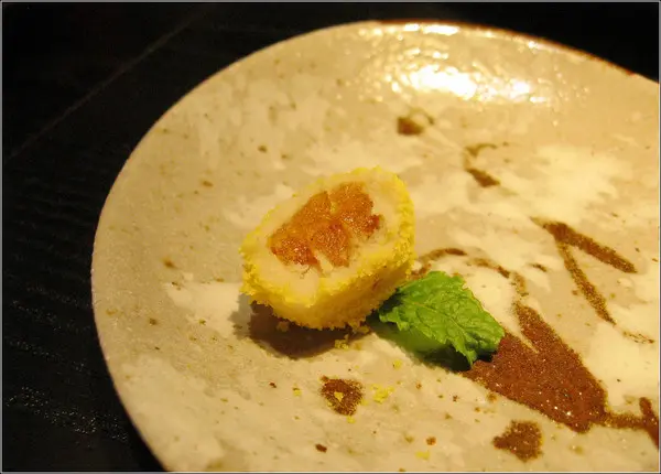 胡麻南瓜醬偽裝成蟹黃網子居然是明太子沙拉做成,當服務生解開謎底時,茉莉整個好嗨森的想趕快嚐嚐呢。