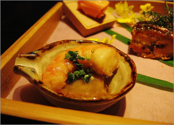 下方日本圓茄用柴魚醬油漬過,細緻軟綿的鹹鮮滋味,搭配脆彈鮮大蝦一起入口~~歐依稀!!!