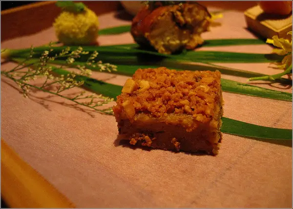 把雞肉打成泥再揉入山藥泥做成方塊糕,上頭撒上花生顆粒作掩飾,你說像不像芋頭糕啊!!