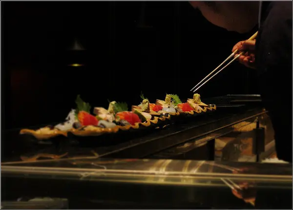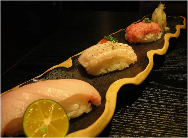 握壽司的擺放也是有學問的~ 依據味道由清爽至濃郁,從左至右擺放