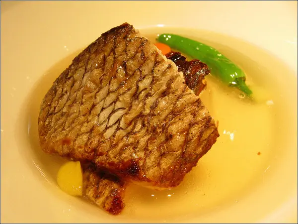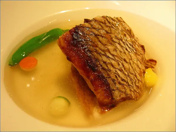烤得側邊、魚皮微微焦香的兩個松鯛魚厚片,淋上由冬瓜與柴魚熬製的薄欠湯汁。