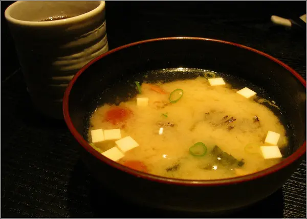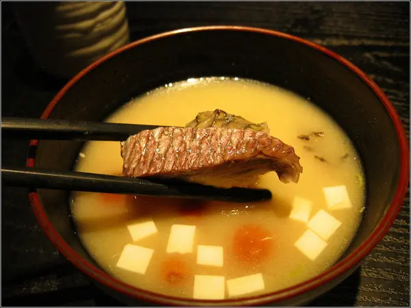 把多種魚肉邊料、嫩豆腐、小菇 做成了這碗味增湯。