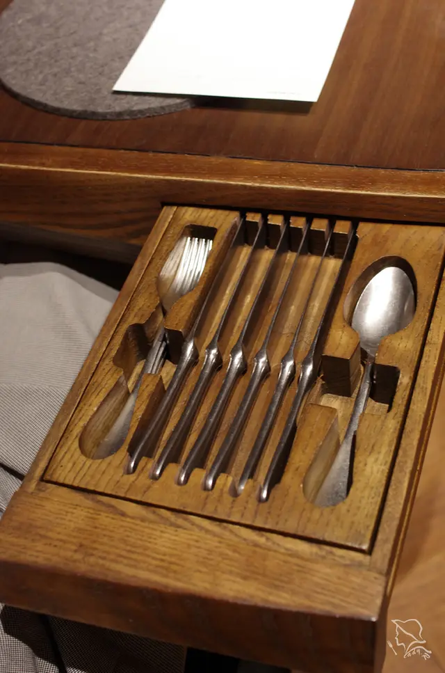餐具則是偷藏於桌子旁的側邊,非常別緻有趣的設計。 NT.1850的套餐共有八道餐點,為了不讓味道混合影響,看似繁多的餐具, 到最後則多是全數用完的。