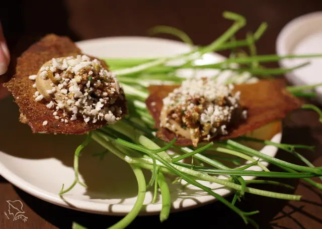 烤得酥脆薄如紙的雞皮鋪底,佐上碎花椰、焦花椰、泥狀花椰, 三種型態的花椰展現,好香。 顛覆了雞皮的油膩感,也賦予了花椰菜新的生命力。
