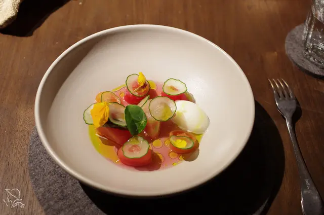 粉紅香檳/蕃茄/山根紫蘇 各式樣的番茄搭配生魚片,紫蘇雪酪, 酸、甜、鮮,淋淋盡致的冷盤,刺激了味蕾正式帶我進入了這場饗宴。