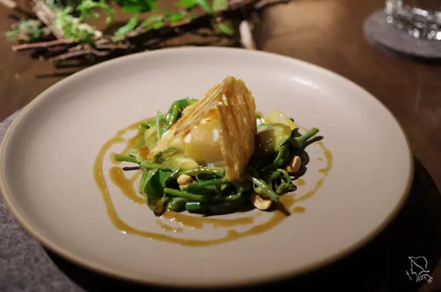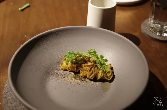 細麵/櫻花蝦/香草 份量迷你的櫻花蝦細麵,香草與蝦油提味, 敢說是我此生吃過最好吃的麵料理,份量迷你卻回味無窮。 一口麵搭配後方的一口伯爵菇湯,芬芳不已。