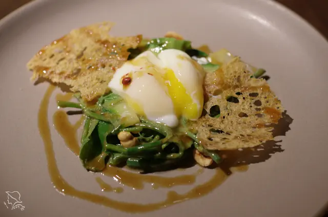 台灣特選的四種時蔬鋪底,搭配半熟水波蛋,四周撒上堅果, 花圈上的多種香料建議以手撕碎拌入其中,使香氣分發, 剩餘的醬汁用脆餅沾附完,好吃到一滴都不捨浪費。