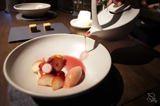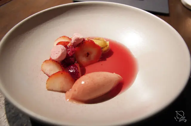 蔓越莓醬汁鋪底,配搭紅心芭樂雪酪, 草莓果肉下方藏有優格, 皆以水果製作,不帶有過多口感的甜點,有點小失望。