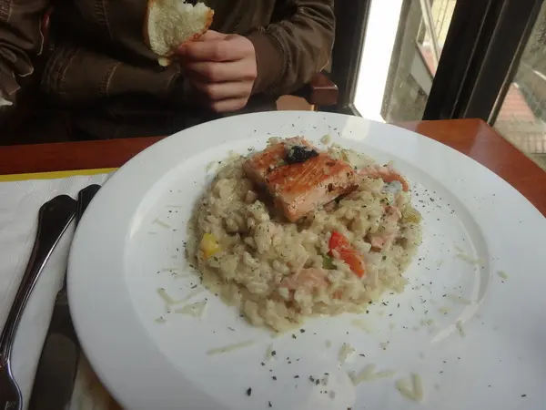 這是我男朋友點的香煎鮭魚排奶油燉飯佐魚卵醬