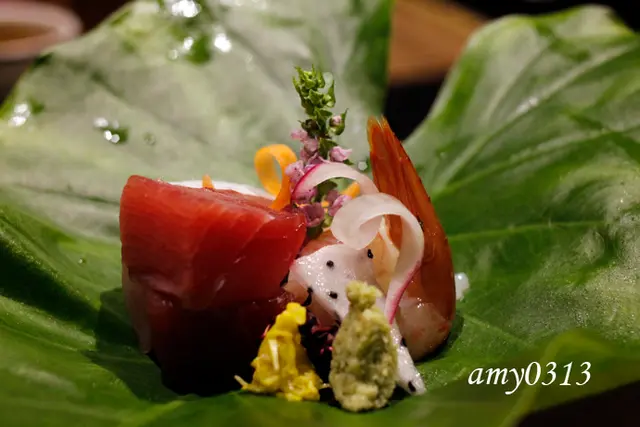 綜合生魚片。生魚片放在芋頭葉上,特別有鮮意呢~。