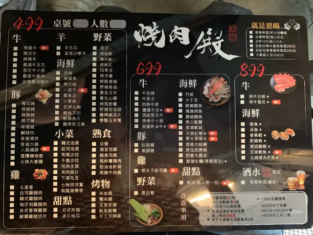 今天,我終於踏進同樣體系的姐妹店「燒肉殿」,499、699、899三種價位吃到飽,899就有和牛隨你吃