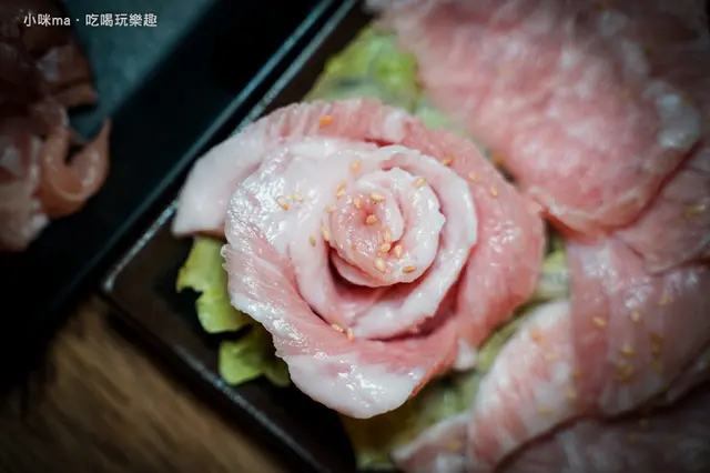 疊成玫瑰花狀的松阪豬吃起來脆脆的,是店裡很熱門的品項喔
