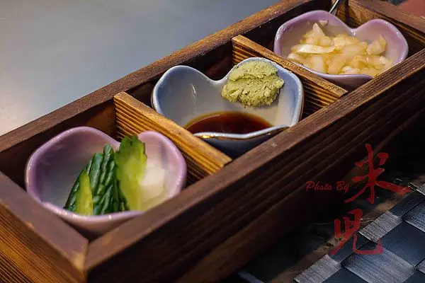 桌上的小物,有吃鐵板燒搭配的洋蔥、沾生魚片的哇沙必醬油,還有醬菜~