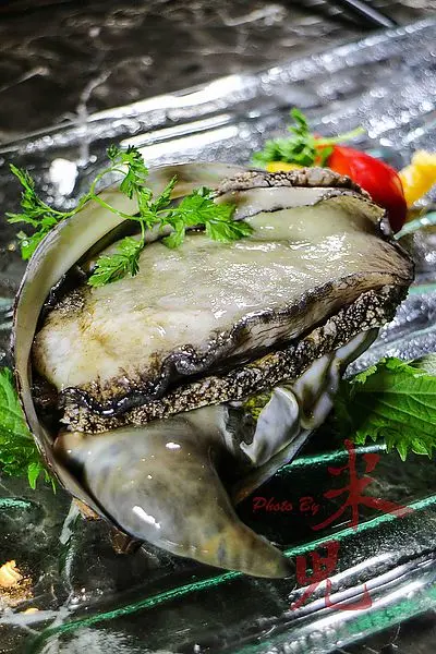 日本蝦夷鮑,個子很大喔,一顆足足有米兒的巴掌大~師傅用鐵板的方式處理,底下的海菜也很可口~