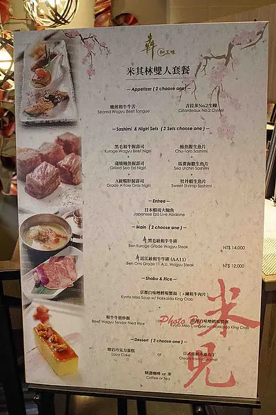 米兒這次吃的是最頂級的「米其林雙人套餐」,所費不貲,從前菜中挑選和牛牛舌或是吉拉多2號生蠔、握壽司則有二套各三款可選一套,熱前菜是日本蝦夷大鮑魚,主菜則是黑毛級和牛牛排(2人14000大洋)或是近江級和牛牛排(AA11,2人分12000大洋),然後是京都白味噌鱈場蟹火鍋涮煮和牛肉片,最後選擇和牛牛筋炒飯或京都牛味噌鱈場蟹粥,甜點則是熔岩巧克力蛋糕或日式焦糖冰霜布丁。