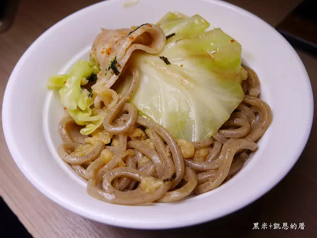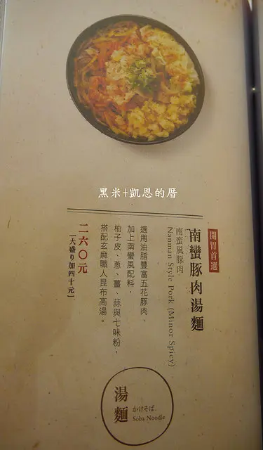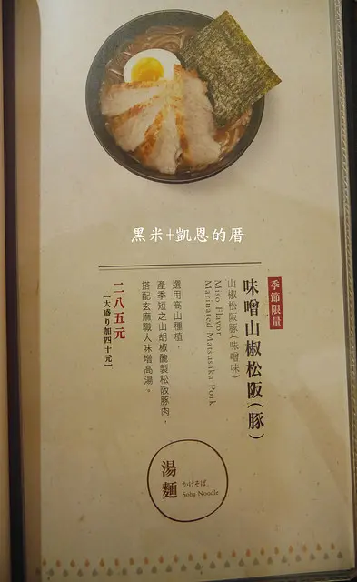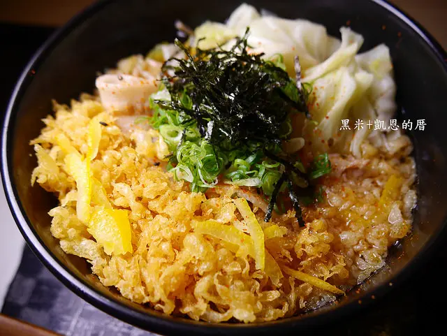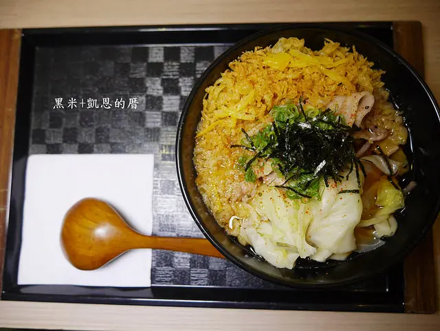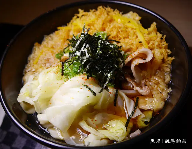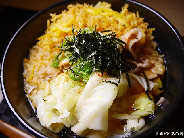 採用昆布柴魚湯底,加入豬肉片 麵酥 高麗菜 七味粉