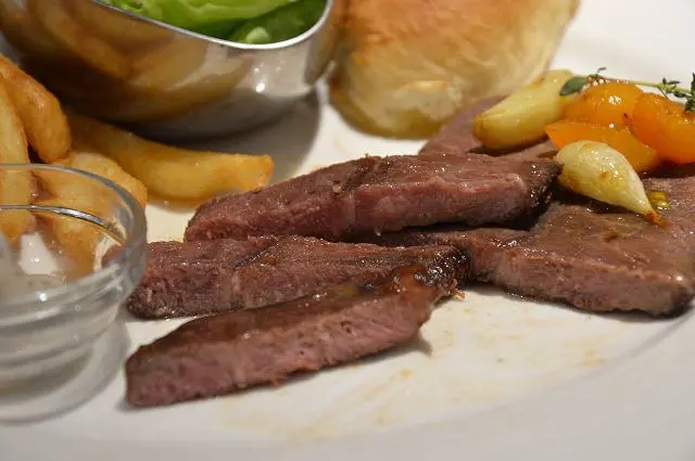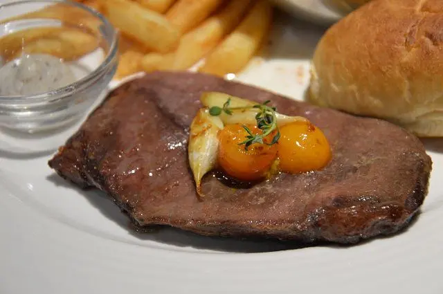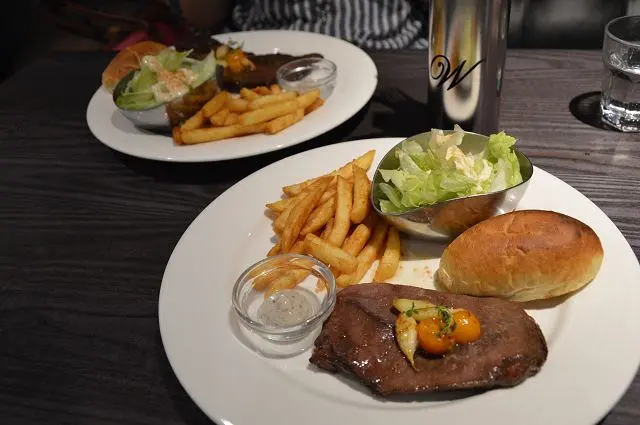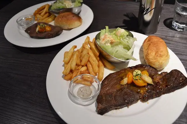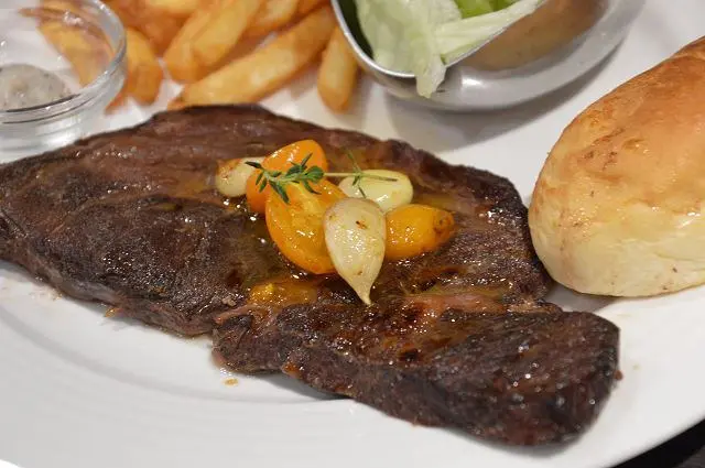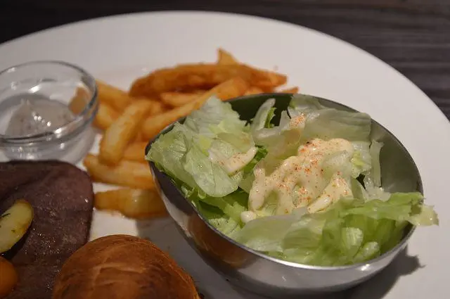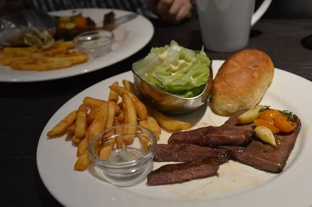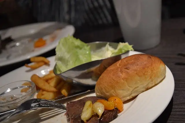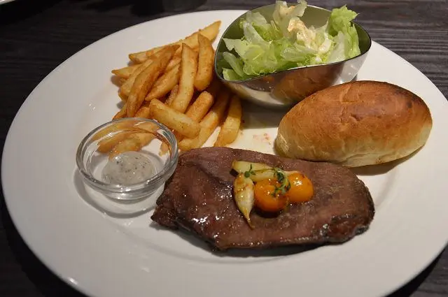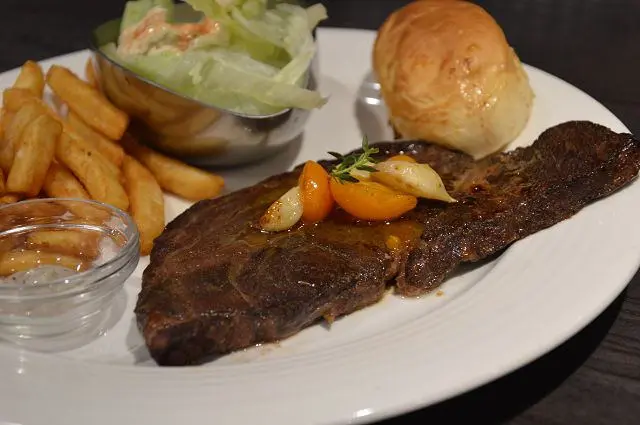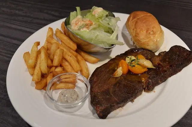 除了厚實的牛排之外,一旁還附有清爽的生菜沙拉、香酥脆口的薯條和充滿飽足感的小麵包。