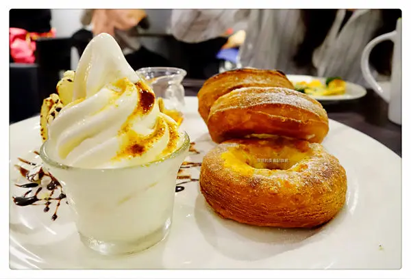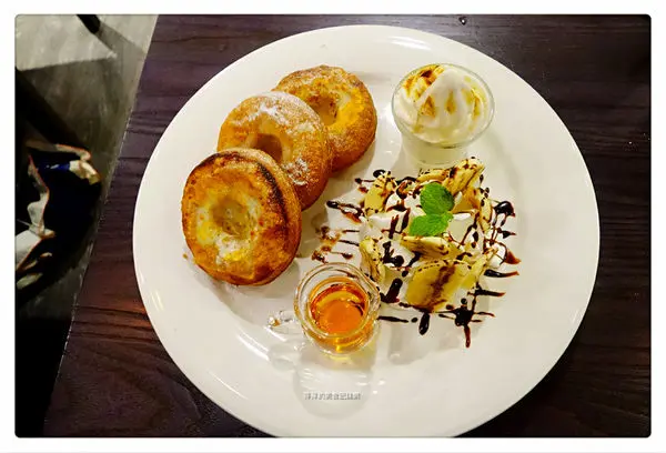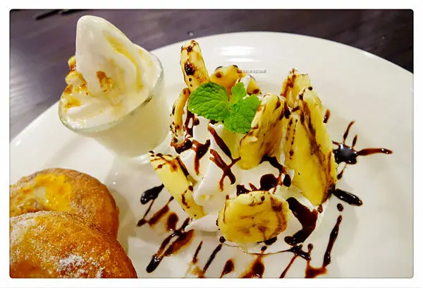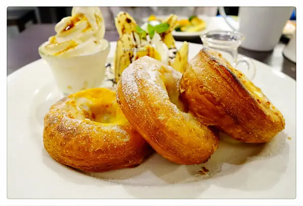 甜甜圈還可以沾著新鮮香蕉及鮮奶油一起吃