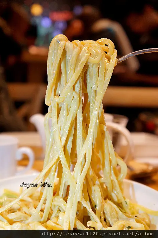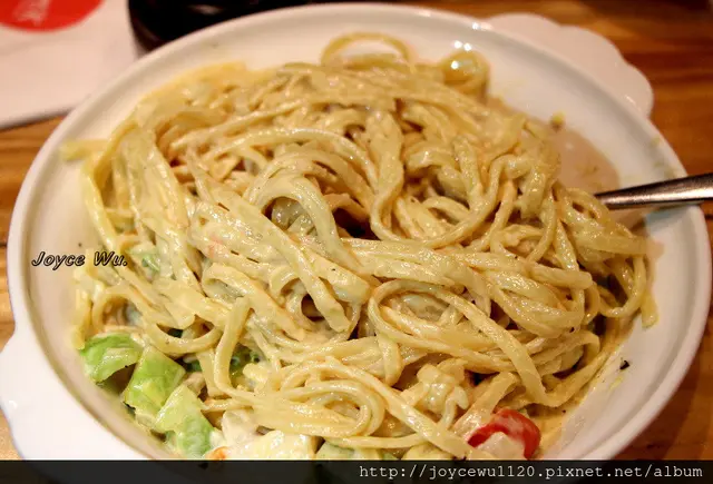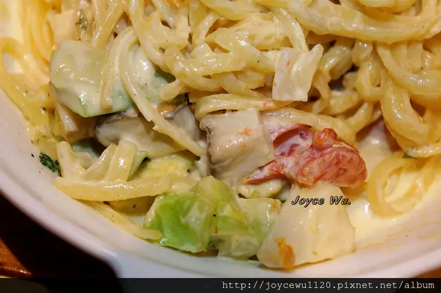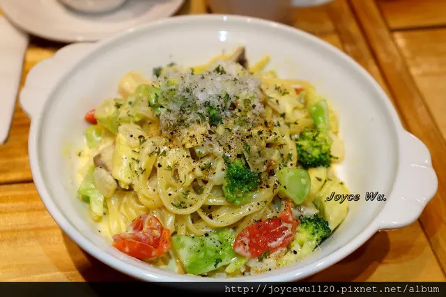 濃郁的奶油白醬不膩口 當季蔬菜配料包含花椰菜 蕃茄 玉米筍 杏鮑菇 起司 洋蔥等
