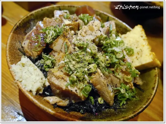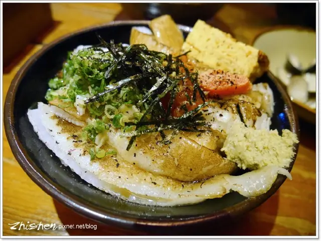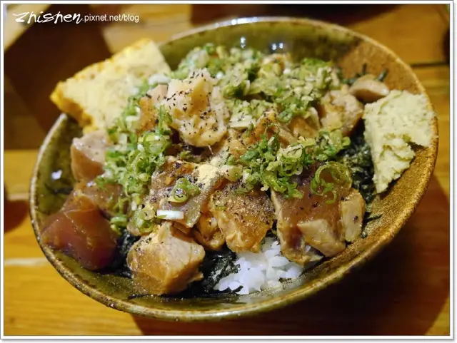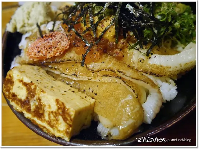 黑鮪先以醬油醃漬,表面稍炙,使得黑鮪在醬油與自身酸爽的風味中帶上些許火烤香氣,魚肉咀嚼中可以感受明顯的鮮美肉味及帶點筋性的口感,點整體感覺較以前品嚐的蔥花鮪魚丼更加清爽~