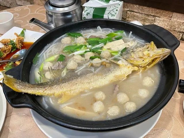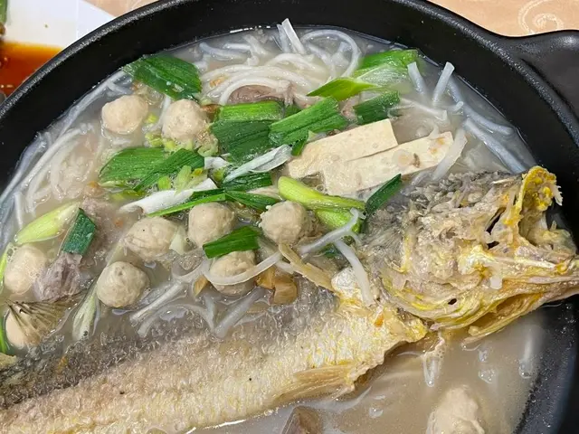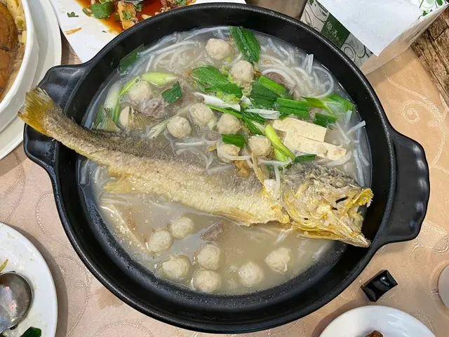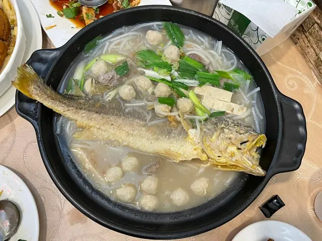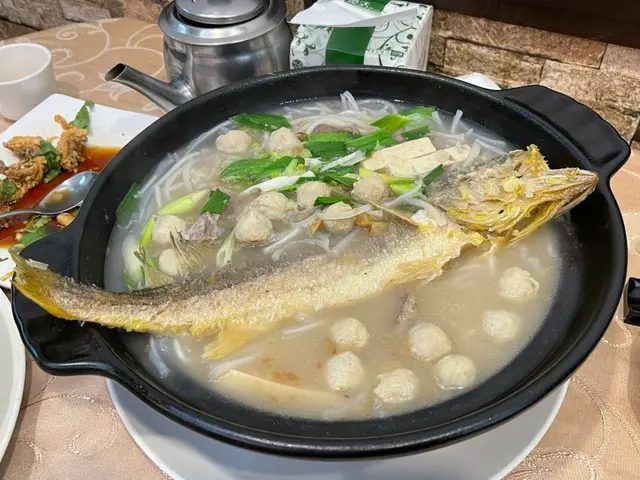 Ω黃魚炸得很酥,自帶的香氣又釋於湯中,和帶點芋香、蒜香的骨頭湯頭十分契合~