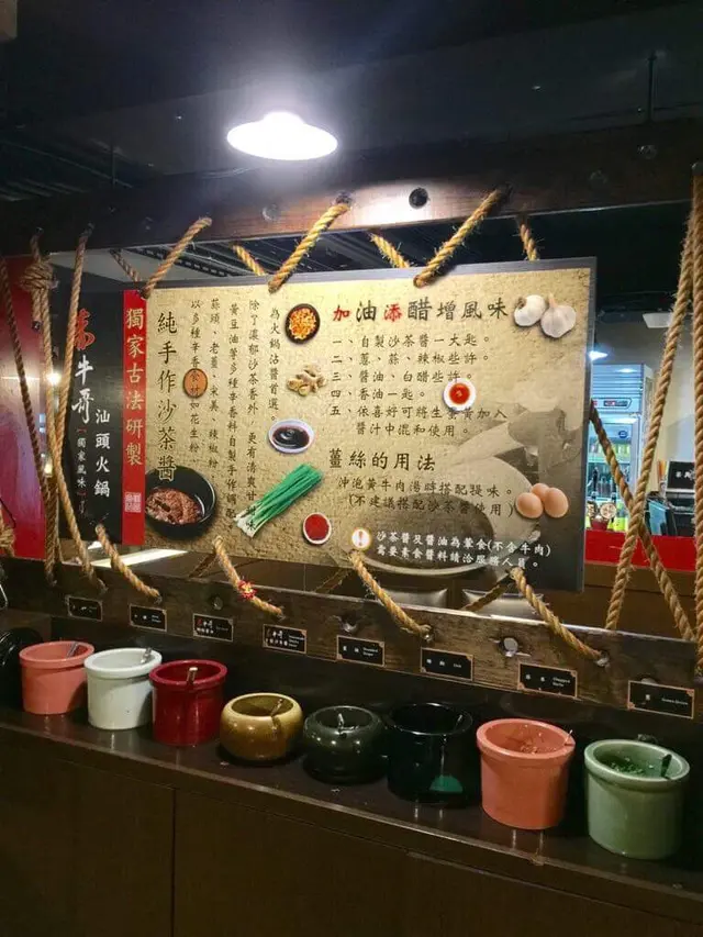 這裏的特色是老闆親人親自指導的秘製沙茶醬配料。很香濃美味而且適合配合不同的美食。