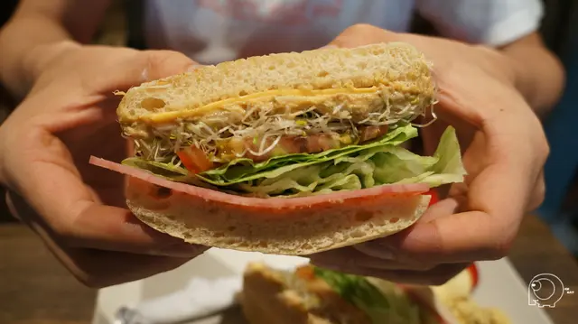 搭配上火腿、生菜、苜蓿芽跟鮪魚泥