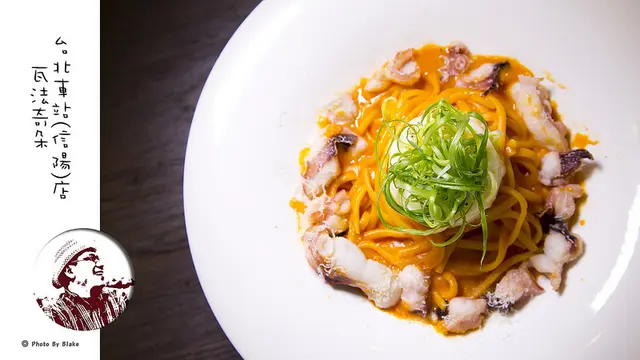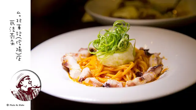 布雷克我點的是這道地中海風炙燒章魚拿坡里義大利麵,瓦法奇朵餐點擺盤都還滿講究的,光是這一道料理,一層一層的,先從麵然後再放上一顆水波蛋,上面則是蔥絲,炙燒章魚則是圍著義大利麵擺成一個園圈,再灑上起司粉。