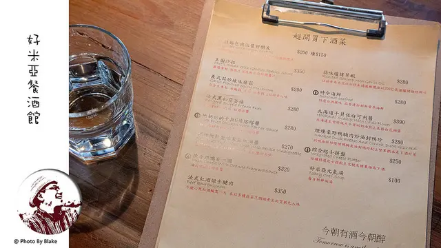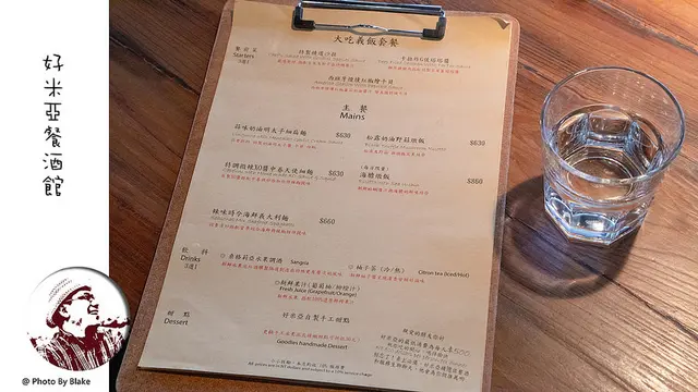 好米亞餐酒館菜單分成餐點與飲品兩本,平日還有商業午餐可以選擇,餐點單點價位從三百多到九百多都有,飲料大多都在一百不到兩百,甜點價格落在一兩百。晚餐的部份有推出很適合聚餐的套餐系列,大口義飯餐點,選擇好主餐,有附前菜三選一、飲料及甜點一份,大口吃肉排餐套餐,更有前菜四選一、湯品、飲料及甜點一份,整個份量都足夠兩個人吃,低消為500元。