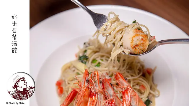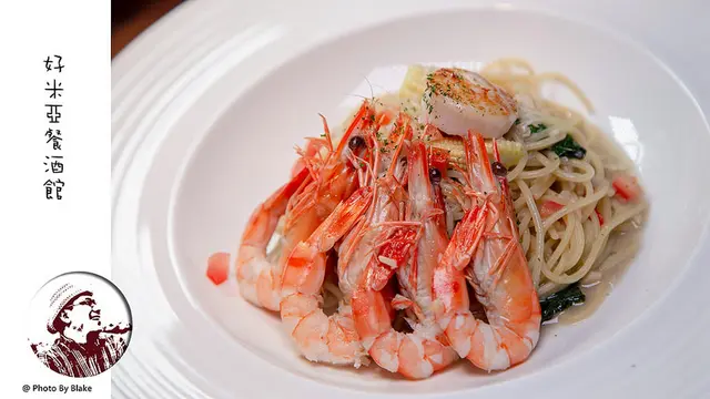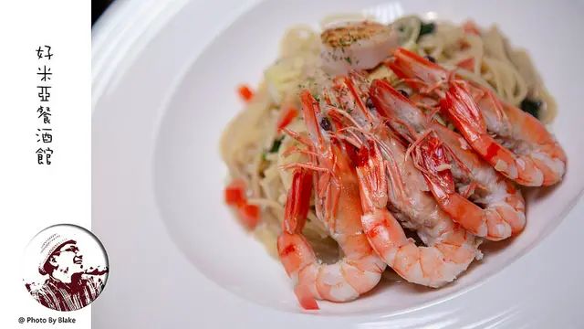 再來一道義大利麵辣味時令海鮮義大利麵,四隻以去殼的草蝦與大干貝,看起來佔滿了整個視覺,義大利麵最困難不是紅白青醬,最難是蒜味的扮炒,在好米亞吃起來蒜味炒的很入味,辣度也沒有那麼明顯,麵條還是很有嚼勁,草蝦原則上都已經去殼了,非常貼心的處理,干貝很甜很Q,我覺得不錯吃。