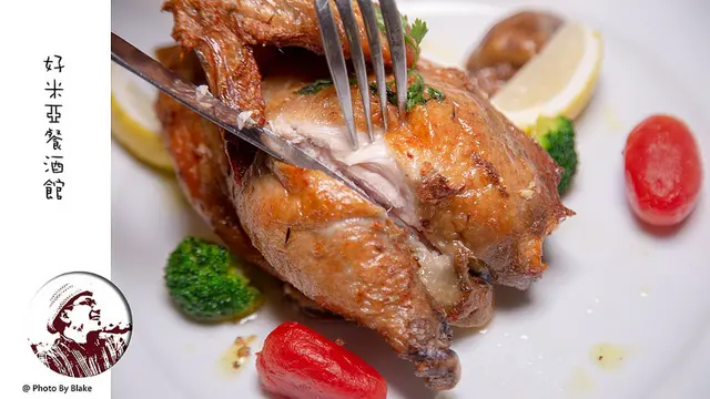 說到聖誕節怎麼沒有烤雞來應景,在好米亞義法餐酒館也不例外,選用台灣特有的桂丁雞,皮薄肉結實的桂丁雞可說是台灣第一土雞,先將雞肉泡鹽水一天,因為前置作業較為麻煩,這道料理算是限量提供,要烤之前再用奶油、百里香與煙燻紅椒粉醃漬,上桌前在淋上松露油。