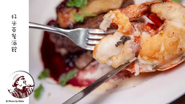 牛排是五分熟,牛肉帶有紅色的鮮嫩感,咬下去口感很棒且多汁,鴨肝煎到外面焦裡面軟化,咬下去入口即化,整個很甜很濃厚,連舌頭都快咬下去,真的很搭牛肉,龍蝦是選用古巴龍蝦,用蒜味奶油去烤,肉質超彈的,也很鮮嫩,搭配的烤黑蒜頭, 吃起來也很鬆軟。