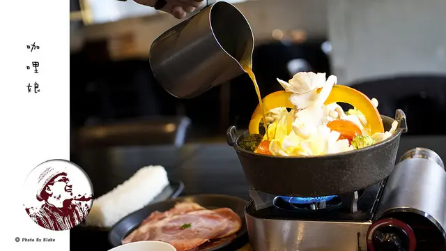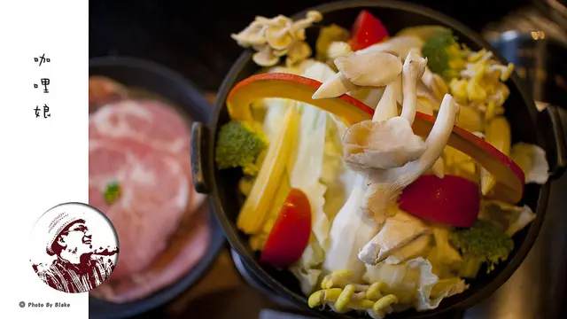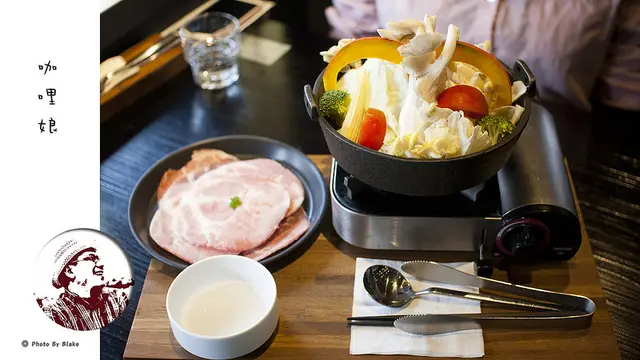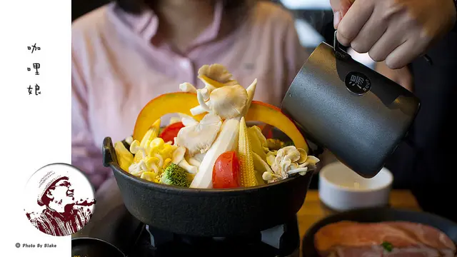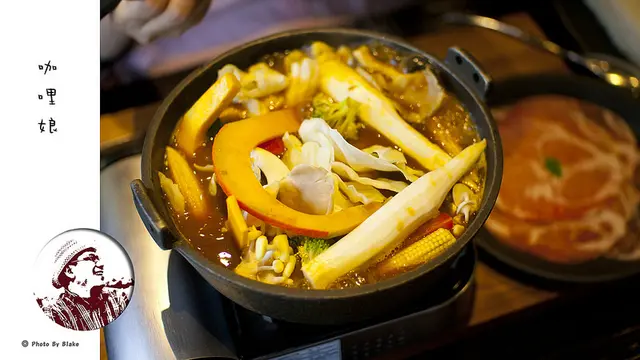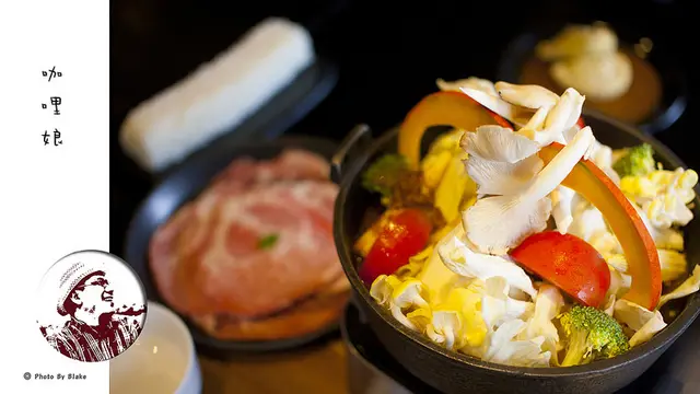 咖哩入湯做成火鍋,在咖哩娘Cari de Madame這算是正常,相較於其他餐廳,這可說是獨特,大量的蔬菜,滿滿一大鍋,裡面有南瓜、蕃茄、高麗菜、花椰菜、玉米筍、秀珍菇與鴻喜菇,還附上一盤豬肉火鍋片,等到要開動用餐的時候,店員會到桌邊服務倒入濃濃的咖哩湯汁。