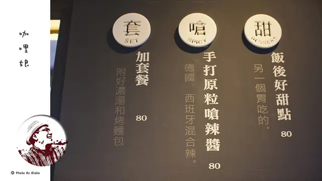 咖哩娘Cari de Madame用餐是沒有菜單的喔!只有牆上有價格跟餐點的簡單介紹,咖哩娘牛、咖哩娘雞、咖哩娘豬、湯咖哩蔬菜通通是單點NT$280元,加套餐要再加NT$80元,會附麵包跟濃湯,其他加點的,像是歐姆蛋或點心,也都是NT$80元,另外還有限量咖哩娘,主要是二次熟成的咖哩,價格就不便宜,一份就要NT$980元,布老大點的咖哩娘單人火鍋與咖哩娘牛排價格都是一份NT$380元,最近還有咖哩娘麵,還沒有機會嘗試。