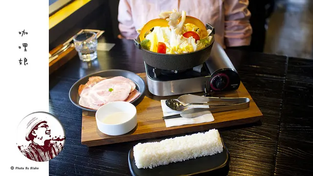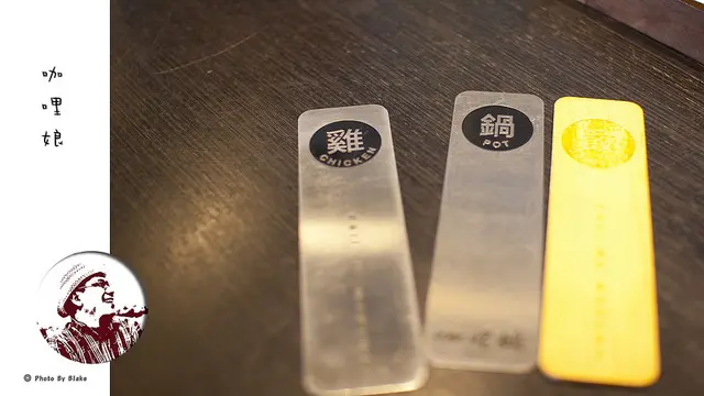 沒菜單,點餐的方式也很特別,桌上都有牌子,鐵排的部份是主餐類,木牌的部份是配餐的,第一次來的時候有點了歐姆蛋,還不錯吃,只是咖哩餃已完售,所以這次來就特地要點上咖哩餃,布老大點的是咖哩娘單人火鍋,布雷克點的是咖哩娘雞。