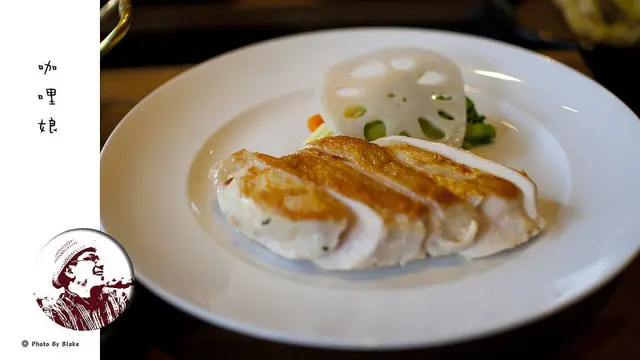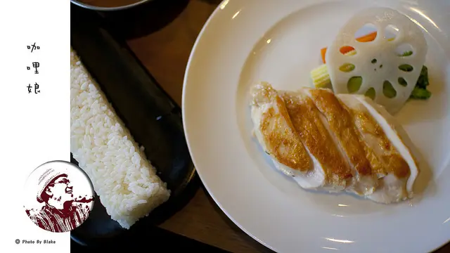 咖哩娘雞選用雞胸肉,料理的手法是以西餐乾煎方式處理,配菜則是花椰菜、玉米筍與一片蓮藕,蓮藕是醋漬,還不錯吃,酸味不會很重,擺盤看似單調,卻也像是西式排餐未上醬料前的餐點,雞胸肉是帶皮去煎的,皮吃起來有一點點脆度,肉質卻比想像中還軟嫩些,口感甚為扎實。沒啥肉汁,單吃甚乾,一定要沾咖哩一同入口,因為雞肉本身味道不重,反而更能帶出咖哩溫潤以及餘韻的香甜,或許這樣越簡單的作法,越能表現出料理食材的味道。