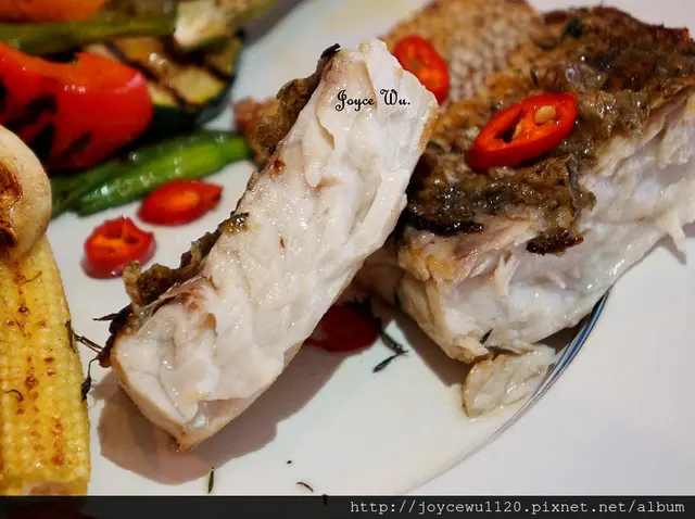 梭魚排以乾煎的方式 起鍋後灑上鹽巴和胡椒 放上香料